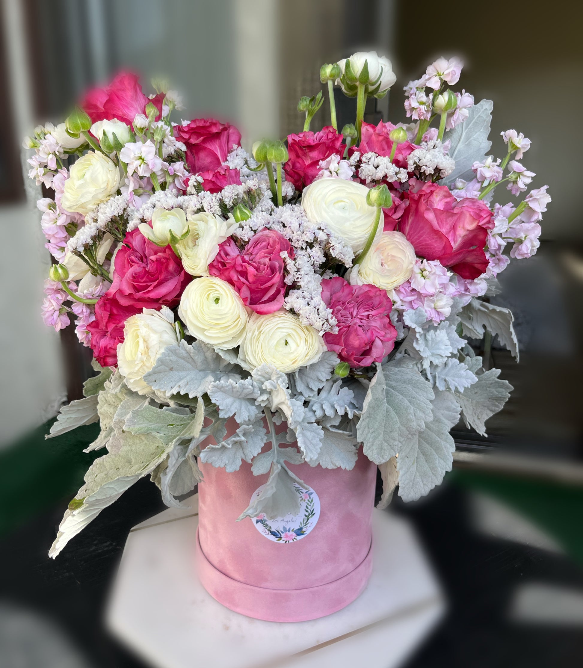 An elegant box with roses, white ranunculus and other flowers to complete the composition.